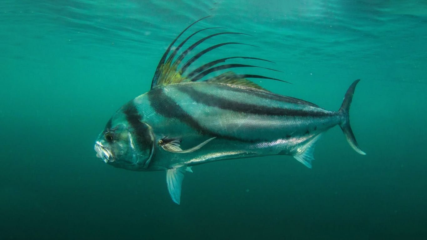 Pez costero icónico del Pacífico Tropical, cuerpo comprimido, dorso azulado-verde, flancos plateados, con una cresta dorsal prominente formada por largas aletas que evocan un “gallo”; rápido, explosivo al picar, y cazador de superficie que ataca cebos y señuelos con saltos y persecuciones.