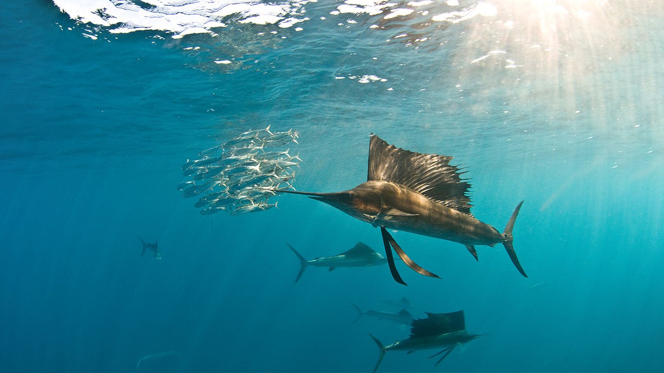 Billfish oceánico de cuerpo esbelto y azul-plateado, con un largo pico estilizado y una aleta dorsal extendida que recuerda una vela; reconocido por su velocidad y saltos espectaculares. En Panamá habita aguas azules de mar abierto, ondeando entre montes submarinos y corrientes, y se alimenta de pequeños peces pelágicos y calamares.